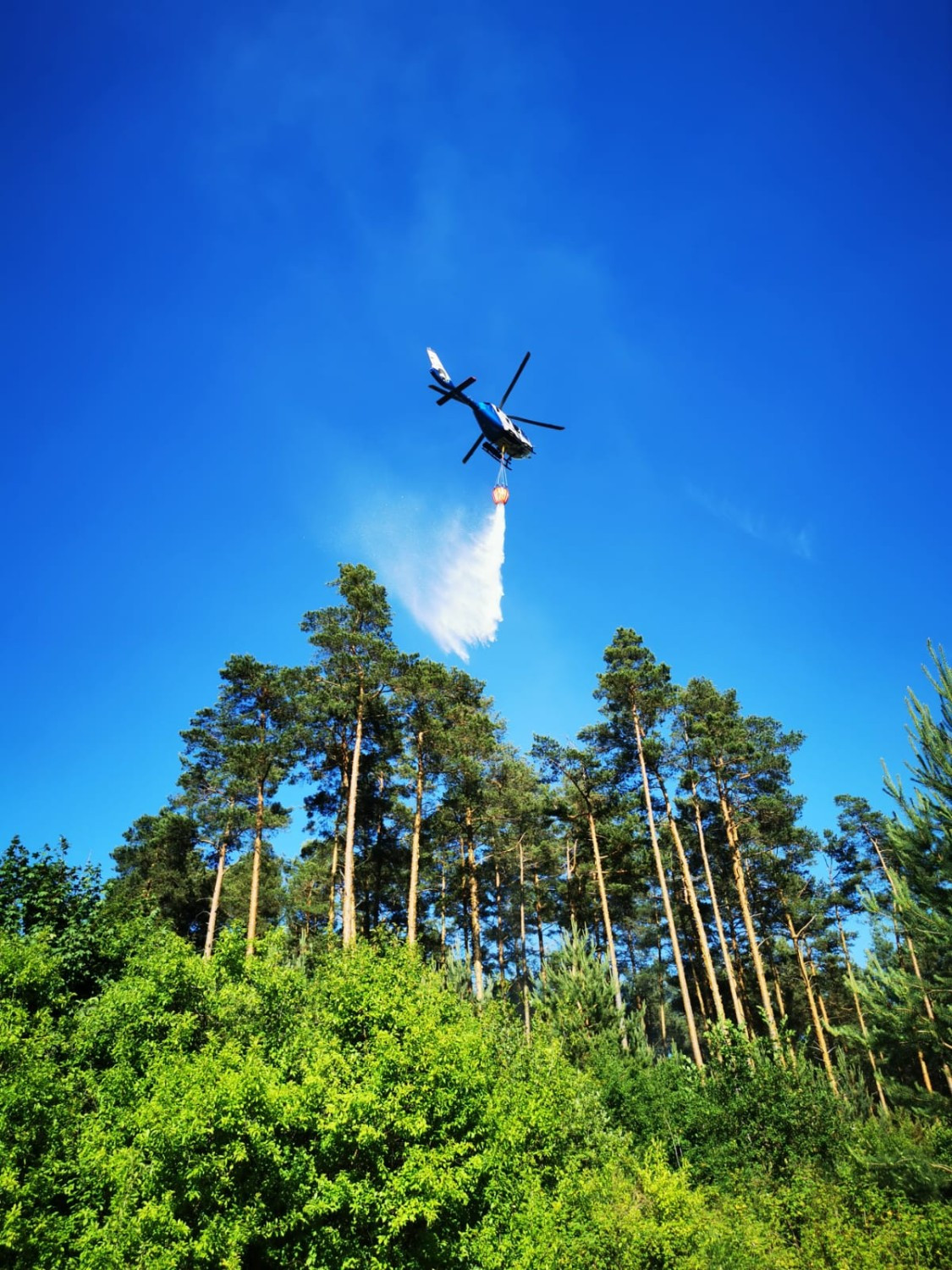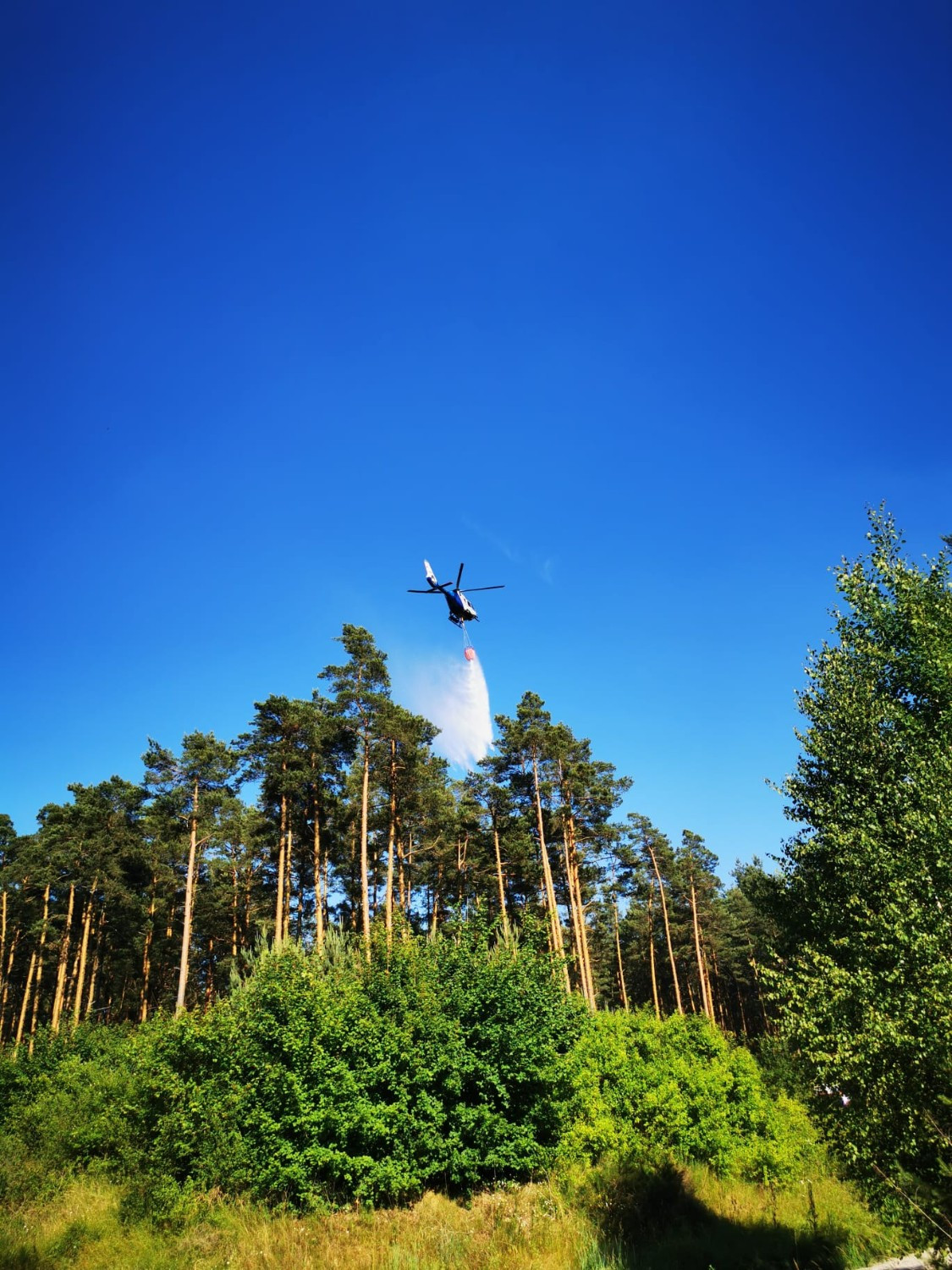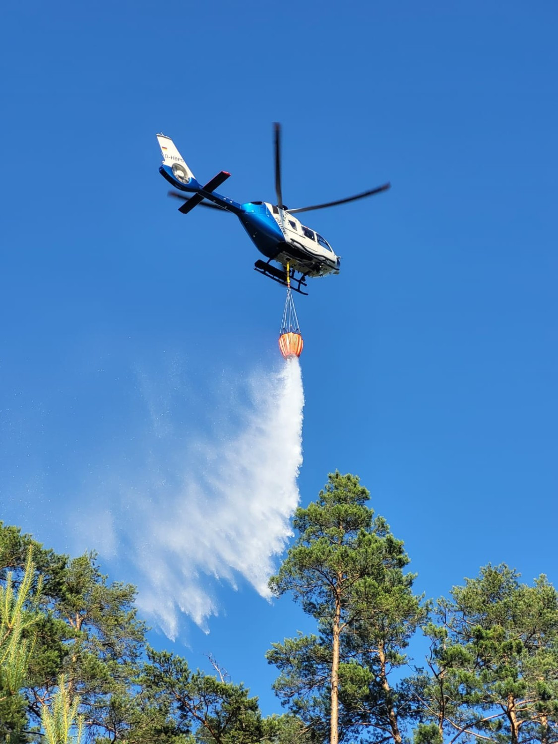 Unterstüzung aus der Luft bekamen wir durch den Polizeihubschrauber Edelweiß, der mit seinem Außenlastbehälter jeweils ca 600 Liter abwarf. Aufgenommen wurde das Löschwasser am Petersgmünder Baggersee. Mit zahlreichen Flügen zur ca. 2km entfernten Einsatzstelle konnte das Feuer schließlich eingedämmt werden. Die Staatsstraße 2223 wurde während der Löscharbeiten durch die Kameraden aus Röttenbach Mühlstetten für den Verkehr gesperrt. Der Verkehr wurde über Petersgmünd umgeleitet.