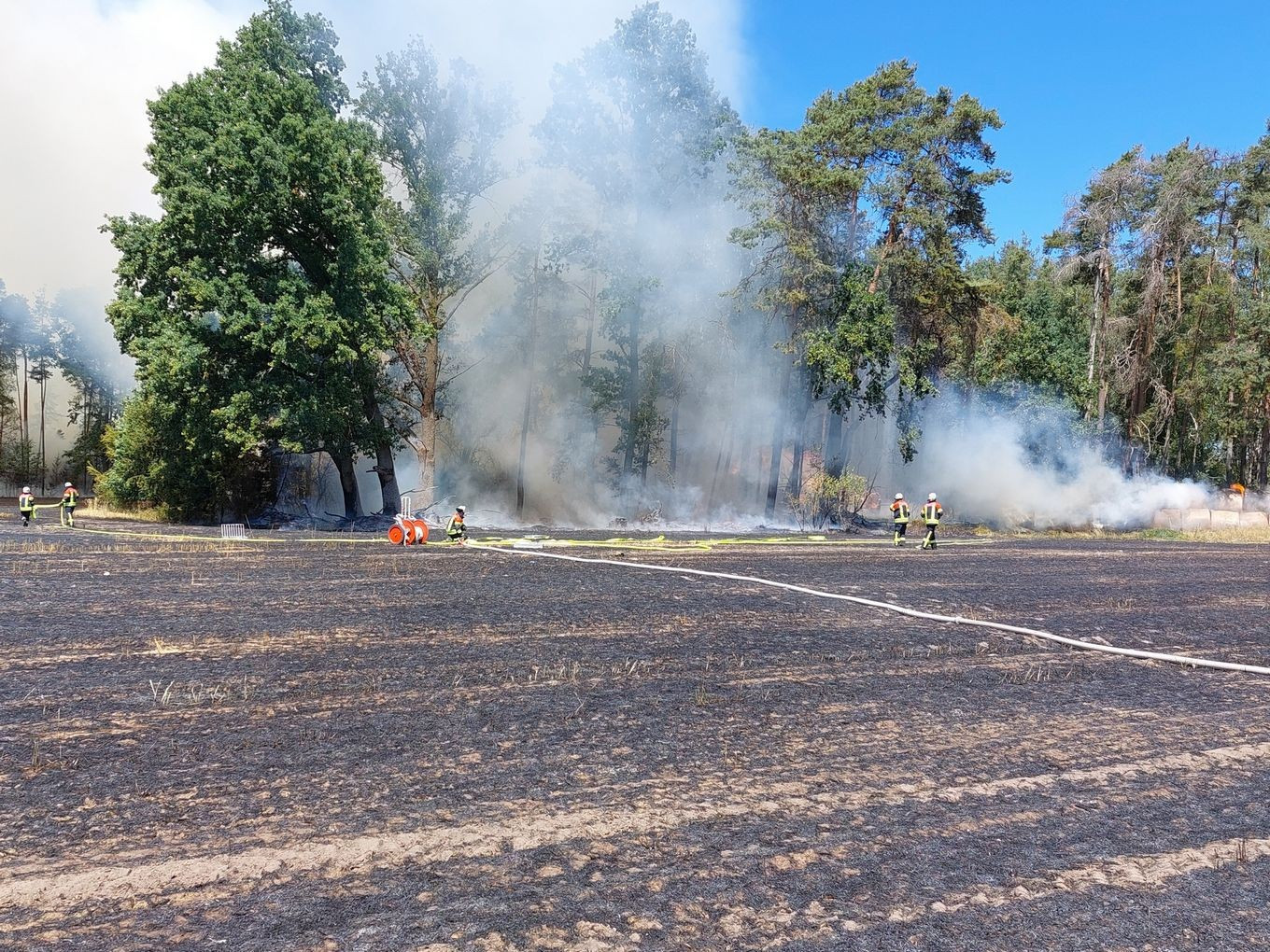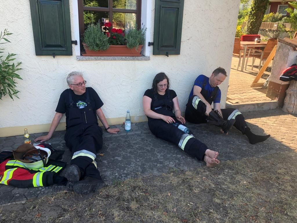 Aufgrund der großen Hitze tauschten wir unsere Einsatzkräfte regelmäßig durch. Um weiteres, frisches Personal für den Einsatz zu bekommen, wurde unsere Sirene nachmittags nochmals ausgelöst. Jeder verfügbare aktive Kamerad*in wurde an das Gerätehaus gebeten.