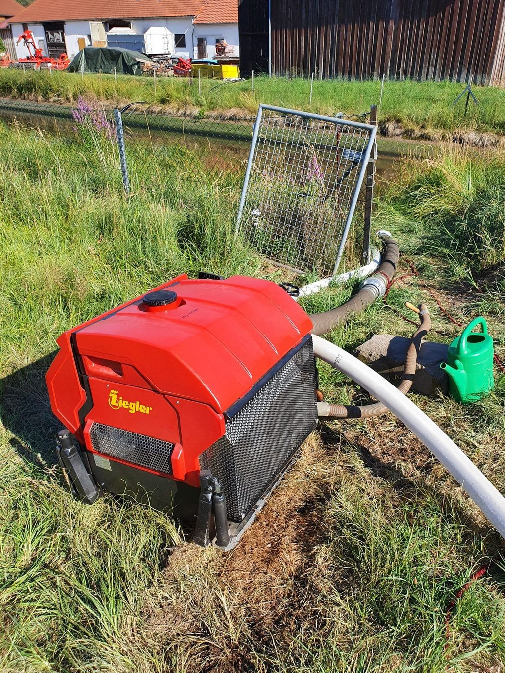 Mittels unserer Tragkraftspritze pumpten wir das Wasser die weite Strecke bis zum Brandort. Aufgrund der Länge der Leitung war eine Verstärkerpumpe von Nöten. Unsere TS war dabei am Löschteich zum Ansaugen positioniert und pumpte bei einem konstanten Ausgangsdruck von 5 bar über eine Laufzeit von 7,5 Stunden Wasser in die Leitung zur Verstärkerpumpe.