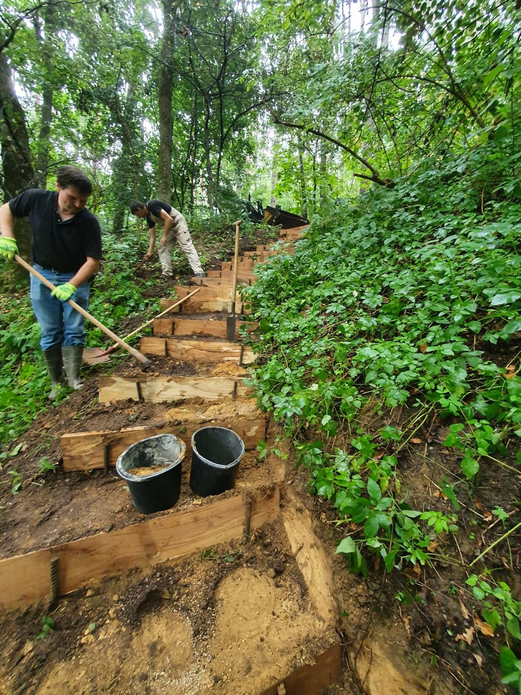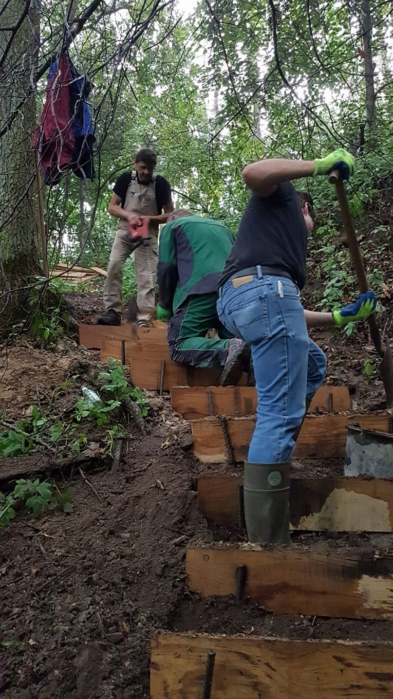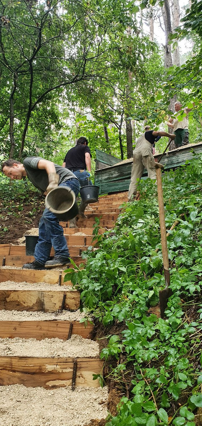 Es war eine schweißtreibende Arbeit, das Gelände für die Stufen auszunehmen und hinterher eimerweise per Hand mit Schotter wieder aufzufüllen und zu Verdichten. Für die Stahlstangen musste zum Teil im Sandstein vorgebohrt werden, damit diese überhaupt Halt fanden.